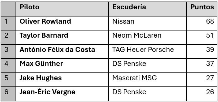 Nissan encabeza el ranking de pilotos, de equipos y de fabricantes. Oliver Rowland es el líder, seguido por el joven Taylor Barnard (Neom McLaren, que usa un motor Nissan). En la competencia de fabricantes (Manufacturers’ Trophy), Nissan le lleva una ventaja de 47 puntos a Stellantis (que incluye a DS Penske y Maserati MSG). En cambio, en el caso de los equipos, van todos muy cerca: no más de cinco puntos separan a Nissan (el líder), Neom McLaren, TAG Heuer Porsche y DS Penske.