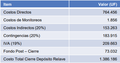 Durante la etapa de cierre y Post cierre, se definen 10 actividades a ejecutar las que serán efectuadas en un periodo que puede alcanzar los 30 años. La duración del proceso de cierre del relave está determinada
